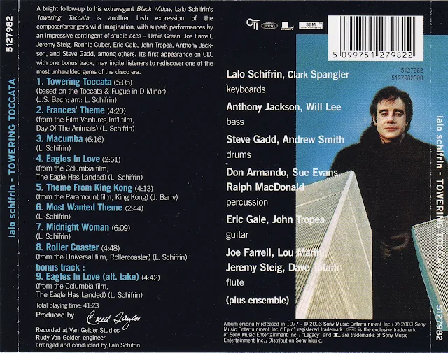 After scoring an unexpected high-profile success with the disco/jazz fusion of Black Widow, Lalo Schifrin quickly recorded a follow-up album in a similar vein. 1977's Towering Toccata replicates the elegant yet dance-friendly style of Black Widow to the tee, right down to the unconventional cover choices. The best of these is the title track, an insistently rhythmic piece that transforms Bach's gothic-organ extravaganza "Toccata and Prelude in F Minor" into a mid-tempo disco workout that backs up Schifrin's jazzy explorations on the electric piano and synthesizer with scratching rhythm guitar and a pronounced dance beat. Other notable moments on this album include "Most Wanted Theme," which is transformed from action-show theme music into a symphonic funk workout, and "Rollercoaster," a funky vamp from the Schifrin soundtrack of the same name that is ideally suited for Towering Toccata's disco/jazz mindset. There is even another monster-movie theme cover in the vein of the previous album's "Jaws"; this time, it's a disco-friendly treatment of John Barry's "Theme From King Kong" that layers atmospheric horn and flute lines over a bottom-heavy rhythm section fueled by wah-wah guitar and synth bass. However, other tracks on Towering Toccata fail to be as distinctive or adventurous as these highlights. For instance, the original tunes ("Macumba," "Midnight Woman") fit the album's mood but are lacking strong hooks and memorable twists in their arrangements that distinguished the originals on Black Widow. This problem of inconsistent material, combined with the fact that the album is basically a stylistic carbon copy of its predecessor, means that it isn't the ideal follow-up to Black Widow that Schifrin fans might have hoped for. That said, the album has enough strong tunes and enough of a consistent sound to please hardcore Lalo Schifrin fans and anyone who loved Black Widow. by Donald A. Guarisco
