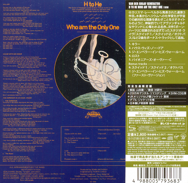 The foreboding crawl of the Hammond organ is what made Van Der Graaf Generator one of the darkest and most engrossing of all the early progressive bands. On H to He Who Am the Only One, the brooding tones of synthesizer and oscillator along with Peter Hammil's distinct and overly ominous voice make it one of this British band's best efforts. Kicking off with the prog classic "Killer," an eight minute synthesized feast of menacing tones and threatening lyrics, the album slowly becomes shadowed with Van Der Graaf's sinister instrumental moodiness. With superb percussion work via Guy Evans, who utilizes the tympani drum to its full extent, tracks like "The Emperor in His War-Room" and "Lost" are embraced with a blackened texture that never fades. The effective use of saxophone (both alto and tenor) and baritone from David Jackson gives the somberness some life without taking away any of the instrumental petulance. H to He is carpeted with a science fiction theme, bolstered by the bleak but extremely compelling use of heavy tones and the absence of rhythms and flighty pulsations. This album, which represents Van Der Graaf in their most illustrious stage, is a pristine example of how dark progressive rock should sound. by Mike DeGagne
